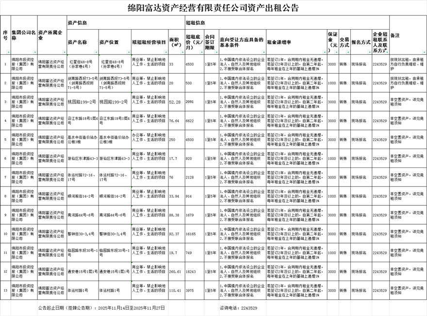綿陽富達資產(chǎn)經(jīng)營有限責(zé)任公司資產(chǎn)出租公告