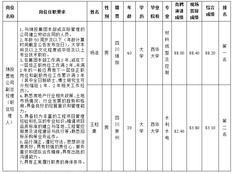 根據綿投集團《關于開展綿投置地公司經理層副職(職業(yè)經理人)內部選聘的公告》(綿投控司發(fā)〔2025〕119號)及招聘相關規(guī)定,經競聘演講、現(xiàn)場答辯等程序,現(xiàn)將競聘成績予以公示。