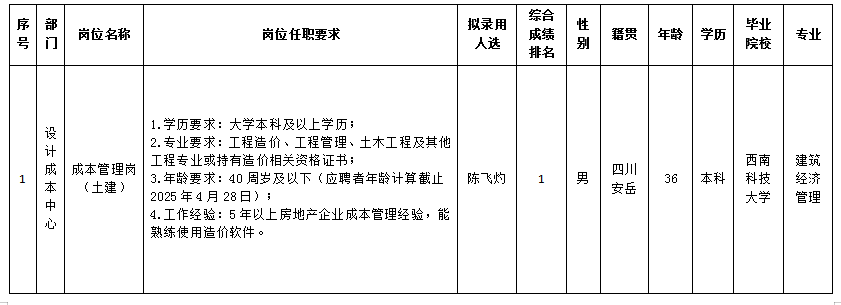 根據(jù)綿陽(yáng)市綿投置地有限公司發(fā)布的招聘公告及招聘相關(guān)規(guī)定,經(jīng)筆試、面試、考察、體檢等程序,擬錄用陳飛灼同志到綿陽(yáng)市綿投置地有限公司工作,現(xiàn)予以公示,具體情況如下: